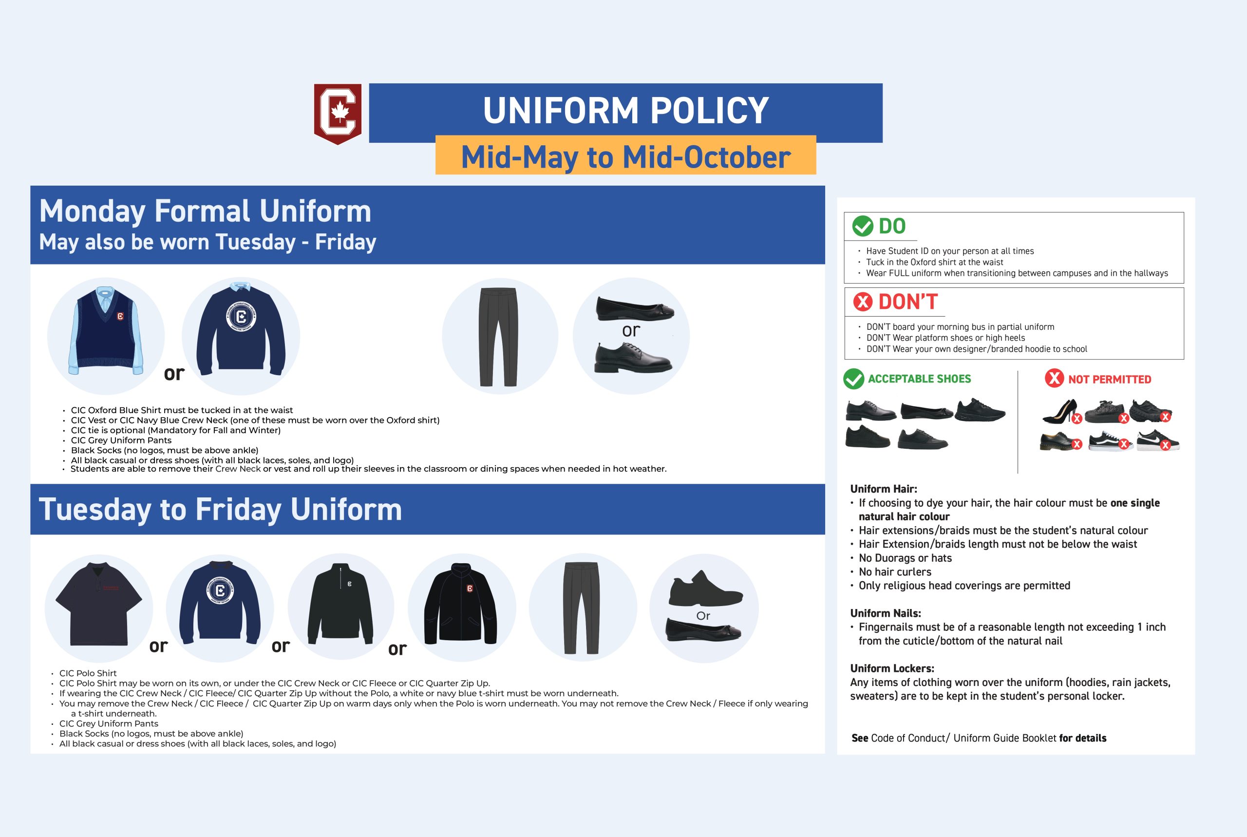 Our CIC uniform identifies us as a community that takes pride in our school culture. Our uniform policy increases school safety, minimizes disruptions, easily identifies trespassers on CIC premises, and promotes improvement in student behavior and decorum.